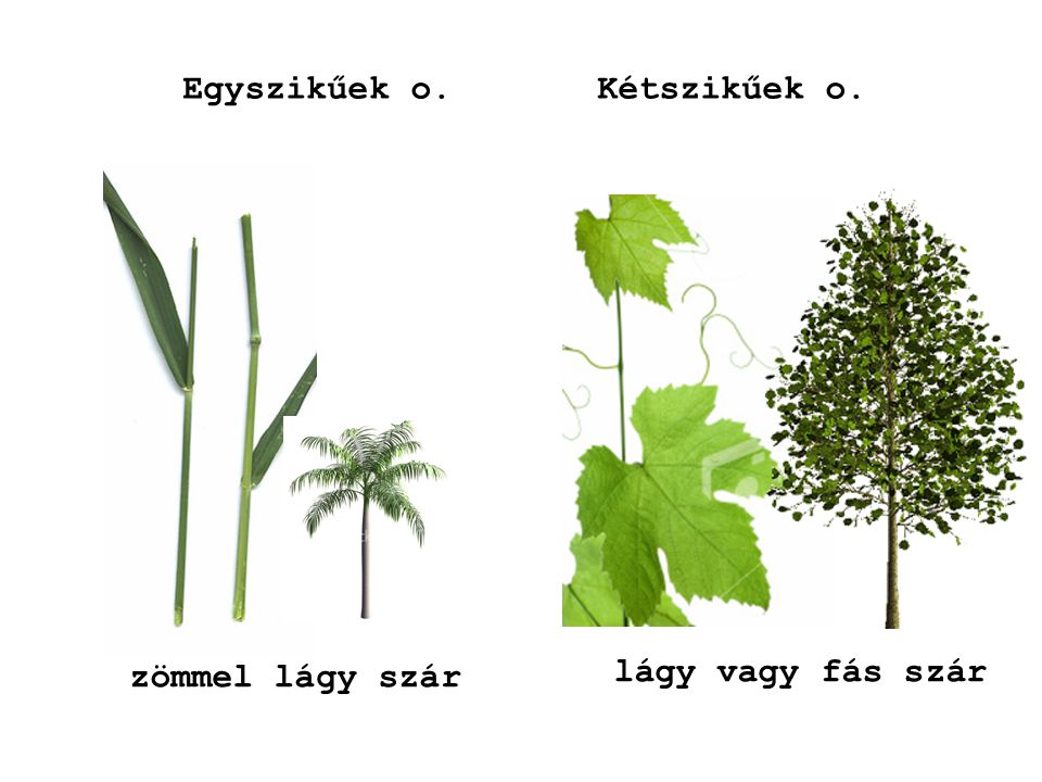 Két, egymással szemben álló sziklevéllel csíráznak – ezeknek a tápanyag raktározásában van fontos szerepük. A kétszikűek sziklevele csírázáskor a talajból kiemelkedik, mert a fejlődő fiatal szár felemeli az első lombleveleket és a még le nem száradt szikleveleket is (ún. föld felett csírázás), ellentétben az egyszikűek sziklevelével, amely a talajban marad, és nem kerül a felszín fölé (ún. földben vagy föld alatt csírázás). A sziklevelek között helyezkedik el a rügyecske, amiből a hajtás fejlődik ki, valamint a gyököcske, amiből a főgyökér. Ez utóbbi gyakran elágazik, oldalgyökereket fejleszt. A levelekben az erek felépítése hasonló, vagyis egy főér ágazik el több oldalérre. Gázcserenyílásaik a levelek fonákján vannak.